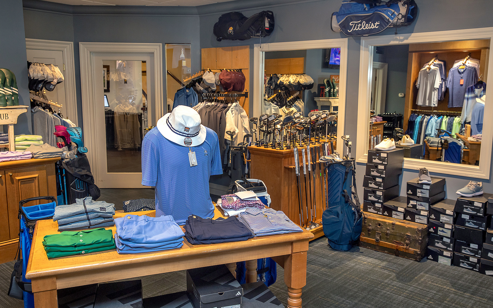 Cherry Valley's golf shop offers a premier selection catering to golf enthusiasts. Choose from top-tier golf clubs by Callaway, TaylorMade, Titleist, and Ping for a customized playing experience. Explore a stylish range of men's apparel featuring renowned brands like Peter Millar, FootJoy, AndersonOrd, Donald Ross, Greyson, Greg Norman, Straight Down, Sunice, and Travis Matthew. Additionally, the golf shop caters to women golfers with a curated collection that includes adidas, EP NY, Kinona, Peter Millar, Straight Down, Sunice, and San Solei, ensuring both fashion and performance on the course.