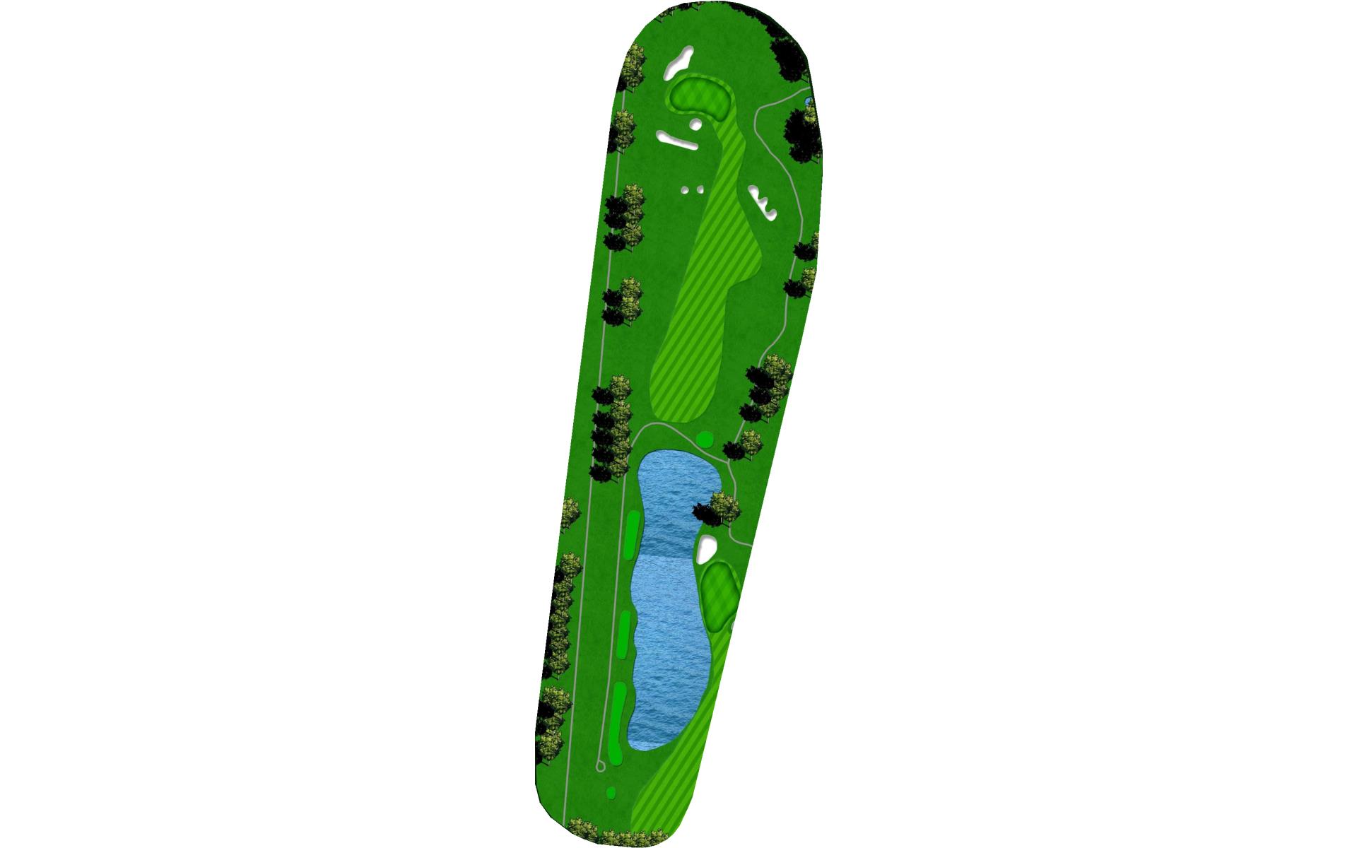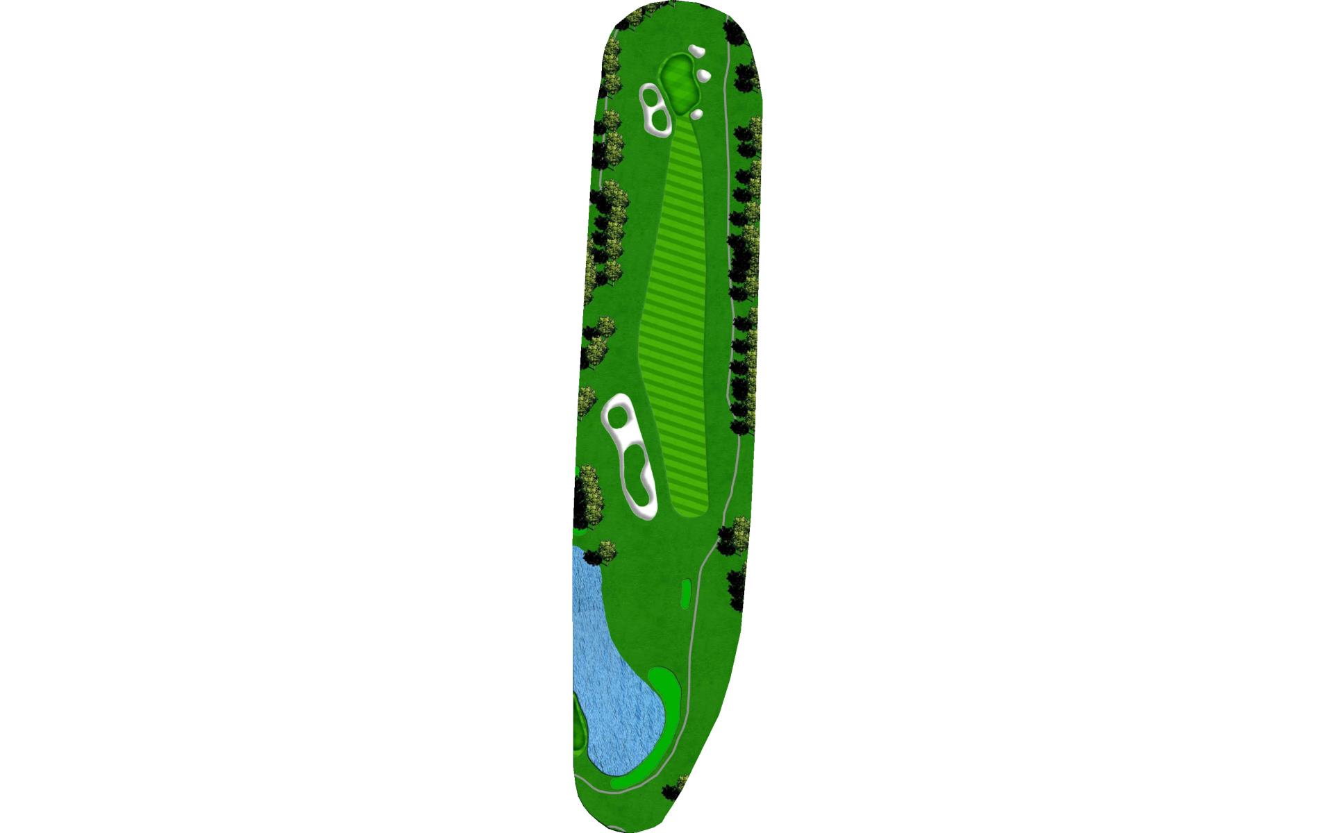 Downwind par 4 with pond at the end of fairway which lines the left side of green as well. Solid tee ball will leave short iron to relatively flat green. Avoid bunkers short right and long.