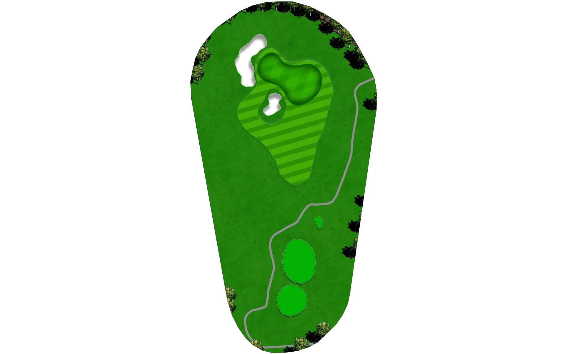 After crossing the wetland behind the previous green, these tees are elevated 25 feet above the wetland. This is done so that the tee shot does not play uphill as much. Standing on the tee, players are looking across a wetland that borders most of the left side of the hole. The preferred side of the plateau fairway is the left in order to shorten the approach shot. This severely sloped green sits elevated with a bunker left and shots falling short may find a deep bunker right or a sloping approach fairway. This entire hole is framed by dense forest along both sides.