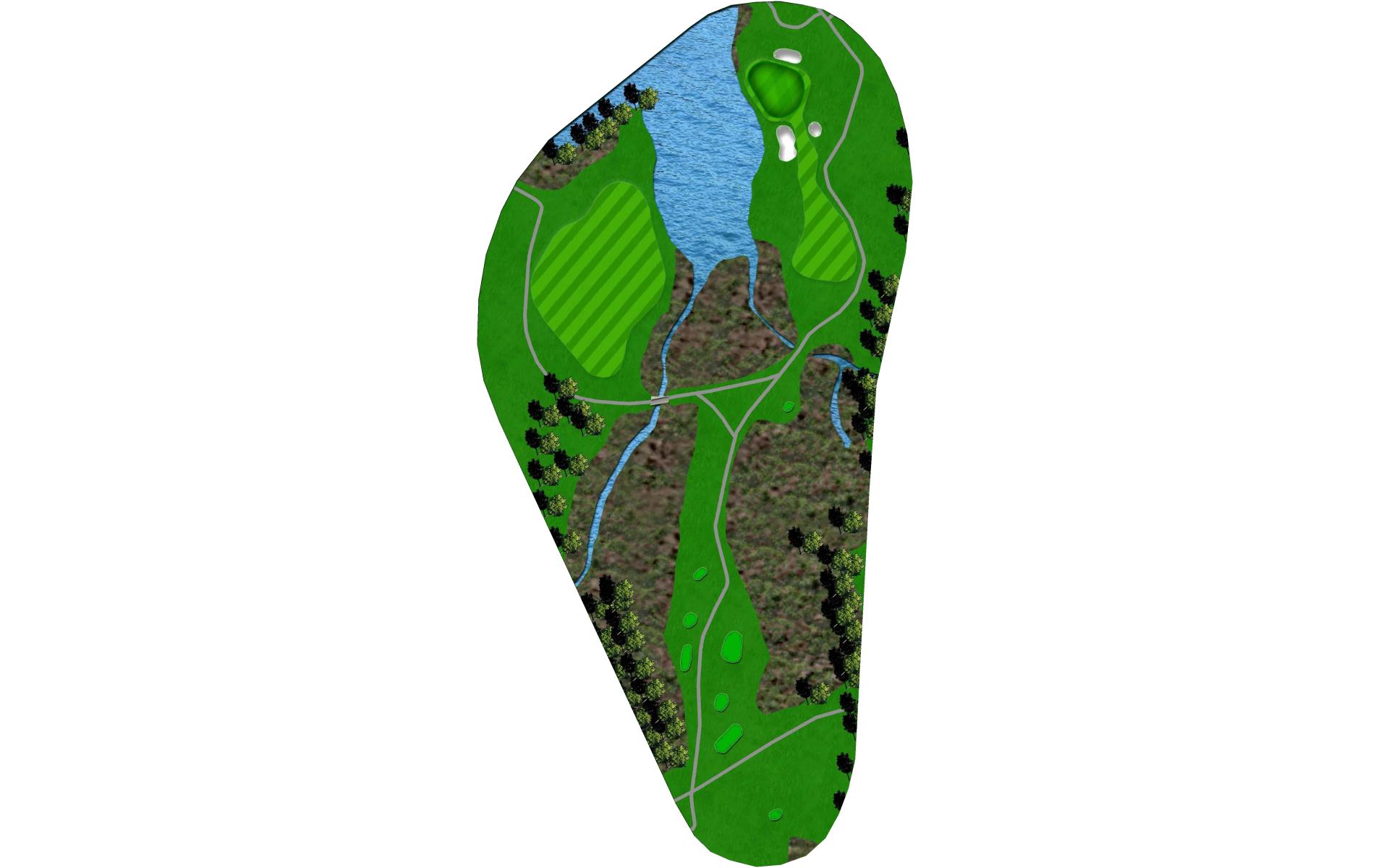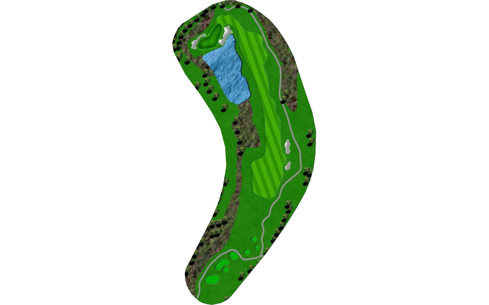 This is a great finishing hole with two separate fairways to choose from. The left fairway requires less carry over the existing wetland but sets up a more difficult second shot over a lake – all carry. The right fairway is narrower and requires a longer carry over the wetland but a shorter approach with no lake to navigate. The awaiting green slopes severely towards the water and sits below the clubhouse with bunkers to either side.